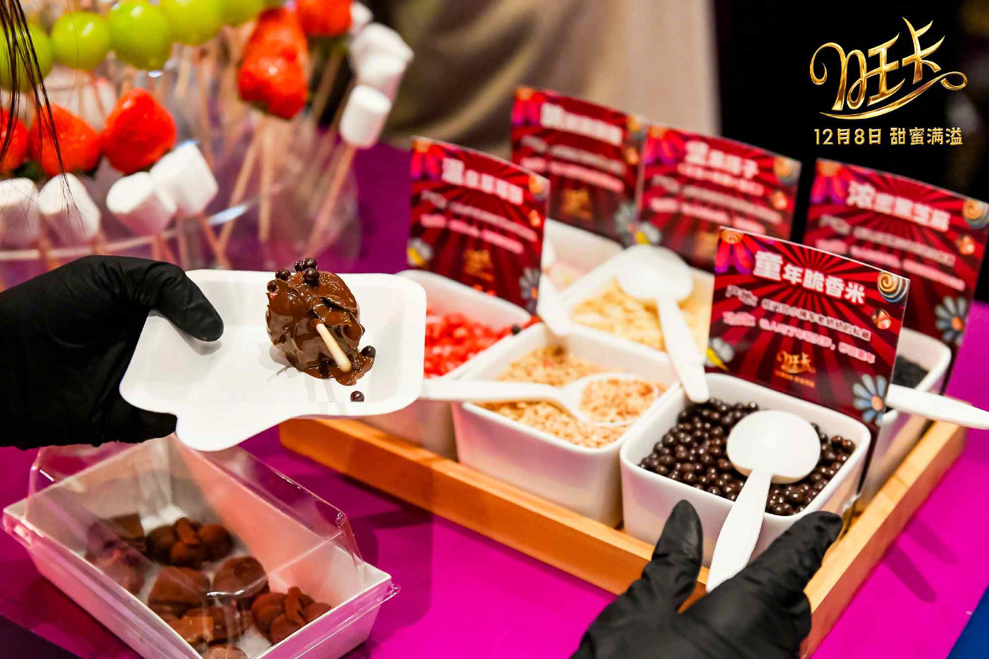 在《旺卡》首映现场,最引人注目的当属电影里标志性的巧克力樱花树。片中,旺卡在粉色樱花树下漫洒巧克力糖果,梦幻烂漫,犹如童话仙境。而在首映礼现场,这棵樱花树也被完美复刻,樱花树四周堆满各色巧克力糖果和花朵,令观众可以亲身走入巧克力“花海”,成为当天最火爆、最出片的打卡点。值得一提的是,活动现场还特设了巧克力DIY工作台,幸运观众可以亲身体验巧克力制作课程,温泉草莓酥、全蛋白肉脯等各种创意十足的DIY原材料仿佛自带旺卡“魔力”,只要吃下一颗就可以获得神奇功效。