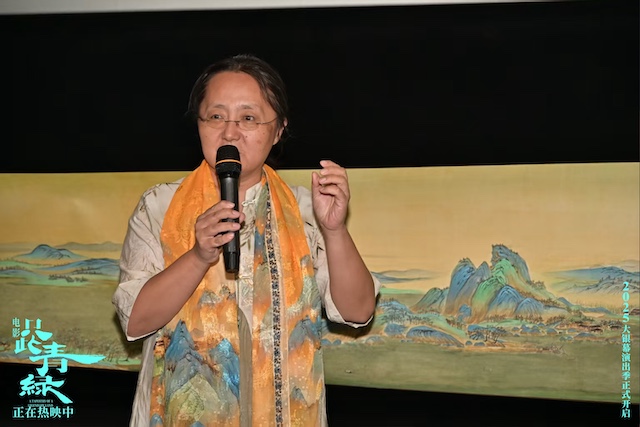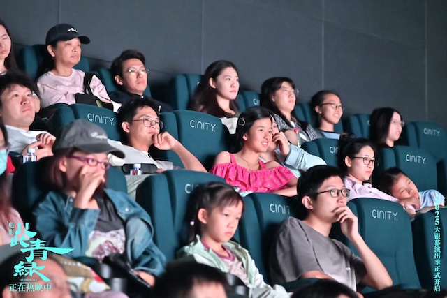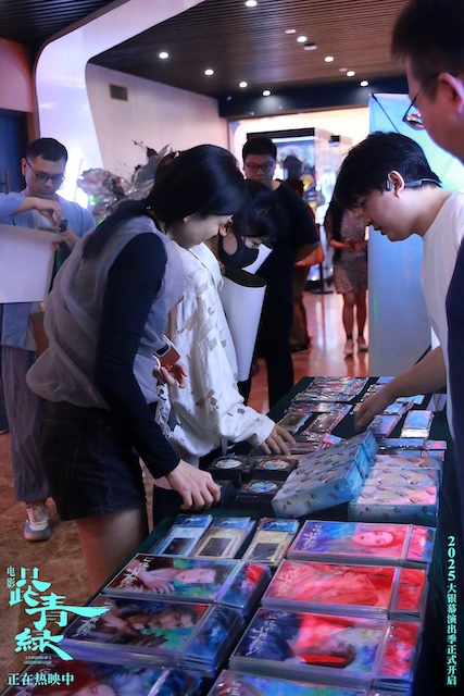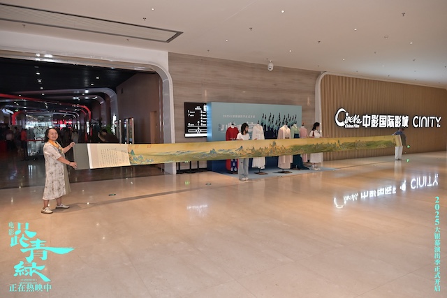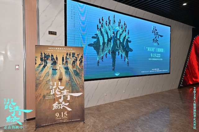 9月13日,在北京中影国际影城举办的“周末见”青绿主题特色放映活动中,一位粉丝阿姨令人格外印象深刻 —— 她特意带着和二十多位同好共同临摹绘制的《千里江山图》长卷来到影院。当画卷徐徐展开,青绿山水奔涌而出,不仅再现了传世名作的恢弘气韵,更传递出一群普通人对于中华文化最深切的向往与传承。映后交流时,她笑着说自己既看过舞剧也追了电影,“两种形式都很震撼,但这次在大银幕上,好几个片段都让我忍不住泪目,而且影院能更清晰的看到演员的表情,非常惊喜”。末了还动情推荐:“看过舞剧的朋友一定要来补这份银幕惊喜,没看过的更要来看,让青绿真真切切走进心里!”