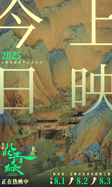 电影《只此青绿》今日正式上映与全国观众见面,并于9月15-17日限量开启三大特殊主题观影场,“晨光见・初见” 于晨光中赴一场初见之约,“放学见・习笔” 陪伴孩子在光影里感悟笔墨文化,“下班见・听雨” 在晚风中邂逅青绿治愈力。9月13-14日电影点映期间口碑持续攀升,豆瓣评分每日上涨,现已涨至8.3分。期待更多观众走进影院,沉浸式感受中华美学的震撼与心动。
