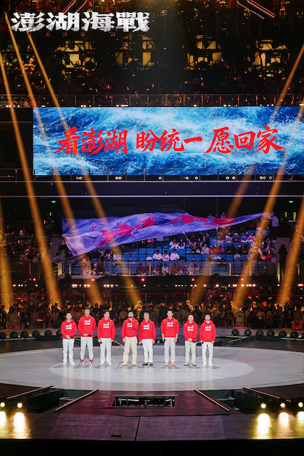 当日,由国家电影局指导,中国电影家协会支持,中宣部电影频道节目中心、四川省电影局、成都市委宣传部主办的"光影绽放·中国电影120周年活力之夜"的活动在成都市高新区万人体育中心举行。电影《澎湖海战》的演员王学圻、杜江、侯雯元、耿乐、胡明、王雨甜、王乃训、刘学参加活动,当晚本片的两位演员代表杜江、侯雯元在万人体育中心现场唱响电影宣传致敬曲《澎湖》,同时一面200平米的电影《澎湖海战》巨幅海报也缓缓地在观众席中伸展开来,巨幅海报亮相的同时,体育中心半空中一块100多平米的电子大屏上跳出“看澎湖 盼统一 愿回家”9个大字!演唱结束后,电影《澎湖海战》8位演员一起上台向观众推荐该片,齐声道出推荐语:“2026,看澎湖,盼统一,愿回家!”