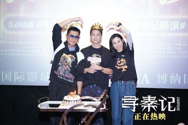活动尾声,现场为主演朱鉴然提前庆生,惊喜推出生日蛋糕。在全场祝福声中,朱鉴然许下心愿:“希望每位观众都能带动身边朋友支持《寻秦记》,票房大卖我们才能拍续集!”古天乐与宣萱则如家长般送上叮嘱与祝福,温馨的庆生场面将现场的氛围推向高潮。