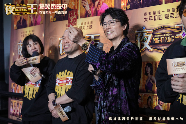 广州路演现场气氛热烈,不少观众都在放映结束后自发鼓掌,称赞影片“春节档看的最开心的一部”“近几年最精彩的港产贺岁喜剧”“笑出眼泪、笑到捶桌”。而导演吴炜伦、领衔主演黄子华的现身更让现场掀起更高热浪。影片作为两人继《毒舌律师》后的二次合作,黄子华现场分享连续两次接导演的戏是一种必然“《毒舌律师》导演找你再拍,当然是同意”。导演吴炜伦回答两部的区别,“《毒舌律师》讲公义,《夜王》讲情义。两部戏都有义字。不管是律师江湖还是夜场江湖,不变的是“情义”。