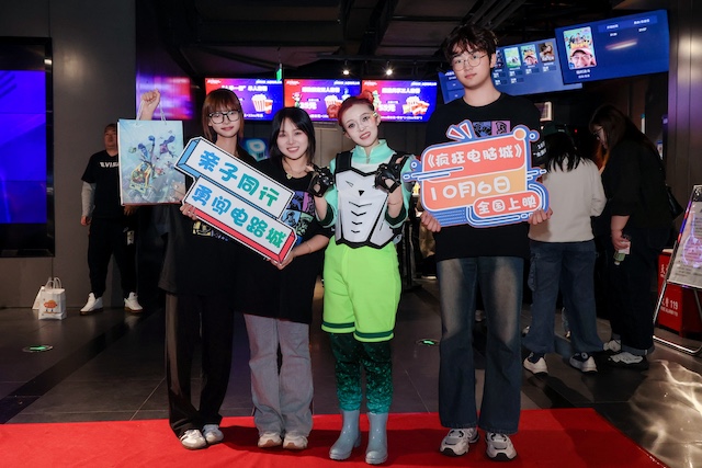 影院前厅化身为“赛博朋克市集”:凭借精湛特效化妆技术打造的“扎普”形象格外亮眼,仿佛从银幕中走出来一般;“皮克西”再次化身照片的魔术师,可爱属性拉满。最吸睛的电路城场景装置墙前,观众排队拍摄打卡,自发话题刷屏社交平台。“女儿为了贴纸,把每个打卡点都拍了遍!”一位家长观众说道,现场发放的“电路城通行证”周边大礼包,成了00后观众们的“社交硬通货”。
