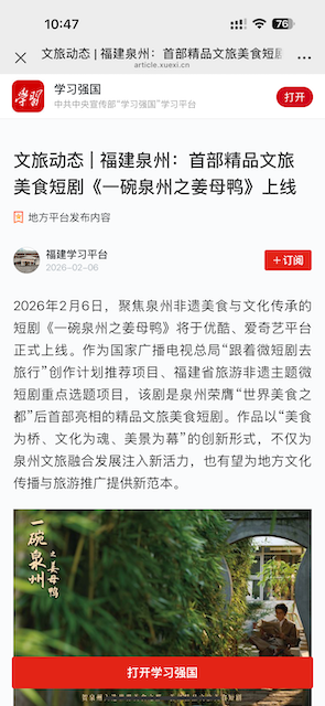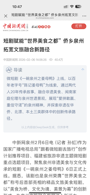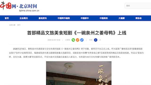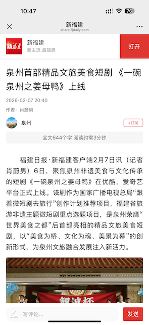 近日,泉州荣膺“世界美食之都”后首部精品文旅美食短剧《一碗泉州之姜母鸭》正式上线。剧集凭借鲜活的本土故事、浓郁的非遗风味和暖心的市井情怀,引发福建及中央各级官方媒体集中关注与报道。中新社、中国网、东南网、福建日报、学习强国、泉州晚报、东南早报等权威媒体和平台纷纷刊发新闻内容,泉州发布、海丝泉州文旅之声等官方新媒体同步推送,形成线上线下联动、传统媒体与新媒体共振的传播热潮。